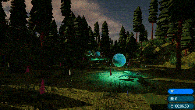 My goal was to implement a scoring mechanic that also functions as a subtle guide, rather than explicitly guiding the player, the wisps reward points, encouraging them to follow them along a designated path. The different colours indicate the point values rewarded.”