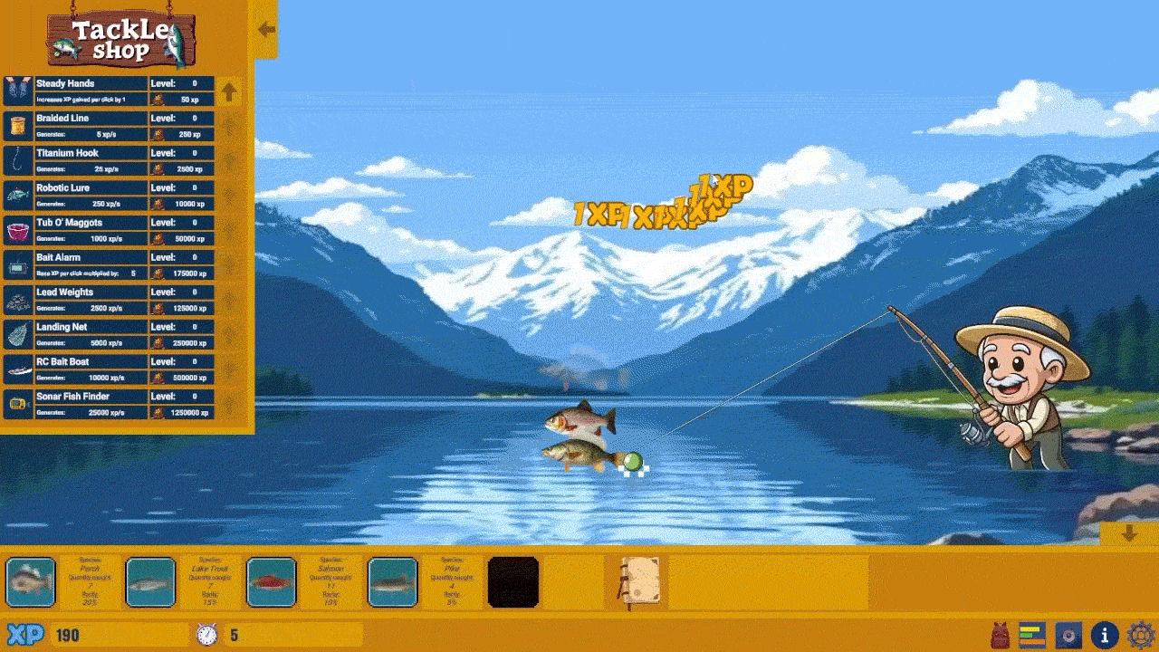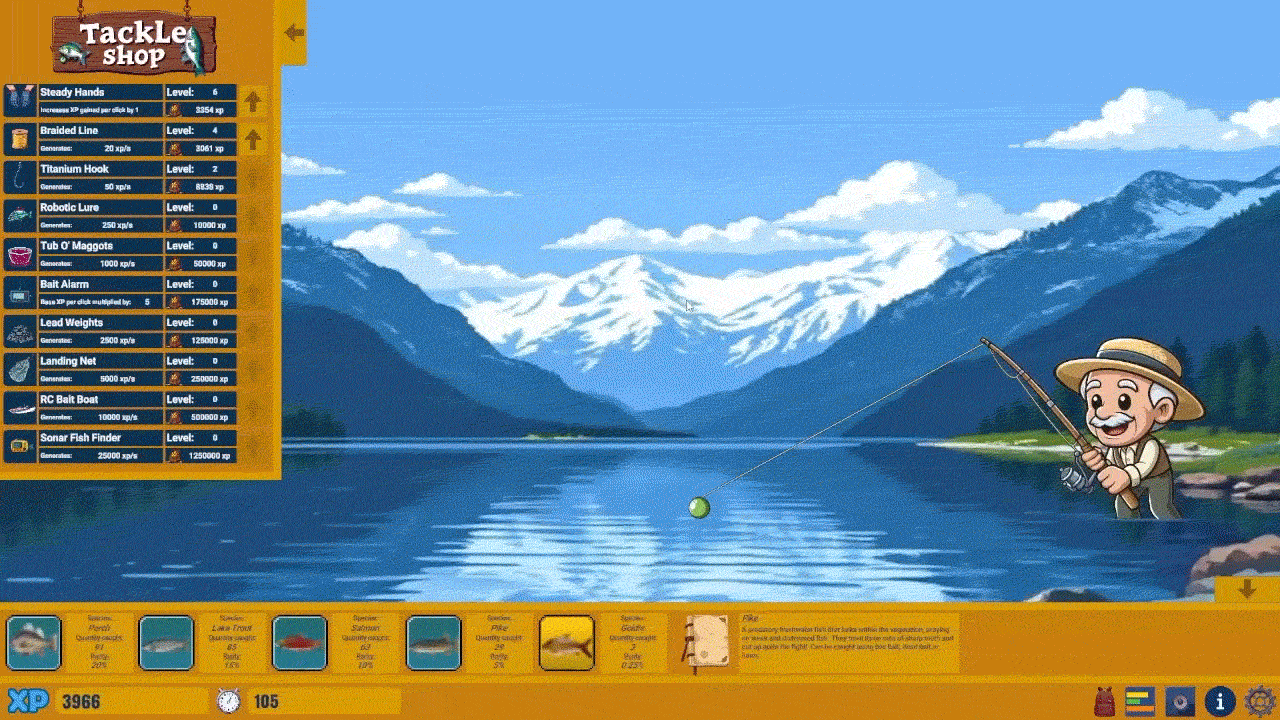 With this game, I wanted to bring my passion for fishing into the idle clicker genre and to replicate the sense of calmness and peace that the sport provides.